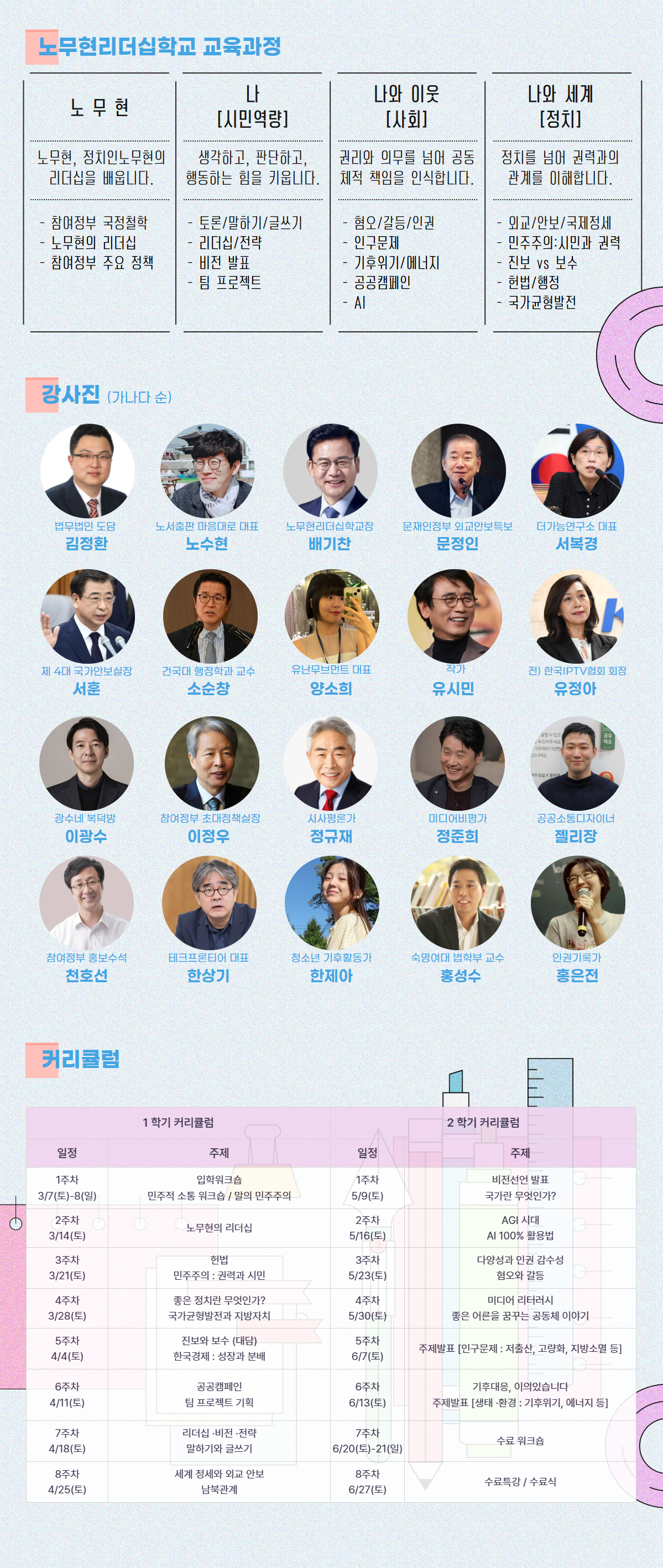 일정 2026년 3월 7일~6월 27일 / (16주) / 매주 토요일 13시~18시(5시간)- 입학워크숍 3/7(토)-8(일) 1박 2일 봉하마을 (★필수)- 평화워크숍 6/20(토)-6/21(일) 1박 2일 강원도 인제군 (★필수)장소 노무현시민센터 (종로구 창덕궁길 73 / 안국역) 1층 다모여 강의실대상 정치적 사고와 행동하는 시민으로 성장하고자 하는 청·장년모집인원 35명 이내교육비 120만원 / 후원회원 100만원- 만 39세 이하(86년 3월 이후 출생) 청년은 노무현재단 회원의 후원금으로 교육비를 100% 지원합니다.- 지역할인 : 최대 30% (지역별 차등 할인 적용)