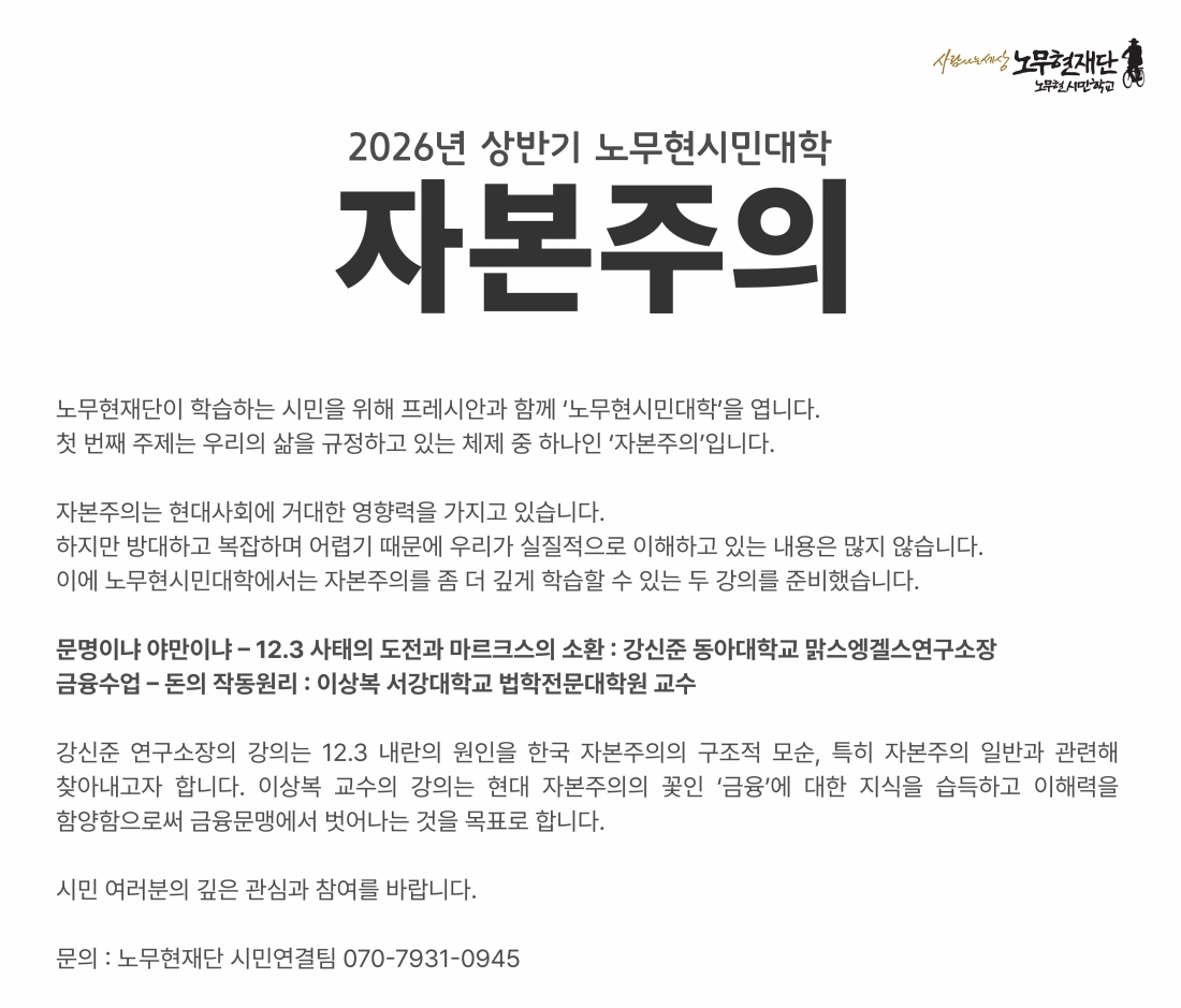 강의주제 문명이냐 야만이냐 – 12.3 사태의 도전과 마르크스의 소환 강신준 동아대학교 맑스엥겔스연구소장 26년 3월 4일 ~ 5월 27일 매주 수요일 오후 7시 ~ 9시 노무현시민센터 다모여강의실 #1. 야만이 온다! (3월 4일) #2. 야만을 막을 방벽 (3월 11일) #3. 자본주의라는 새로운 문명 (3월 18일) #4. 자본주의의 묵시록, 마르크스의 <자본> (3월 25일) #5. 마르크스의 방벽 (4월 1일) #6. 마르크스 이후 마르크스의 실천 (4월 8일) #7. 마르크스 실천의 유산과 잔재 (4월 15일) #8. 마르크스 없는 한국사회 (4월 22일) #9. 한국사회, 야만의 전성시대 (5월 6일) #10. 한국 사회의 과제 (5월 13일) #11. 못다 한 이야기, 우리가 아직 모르는 마르크스 (5월 20일) #12. 에필로그: 무엇을 할 것인가 (5월 27일)